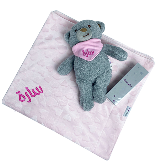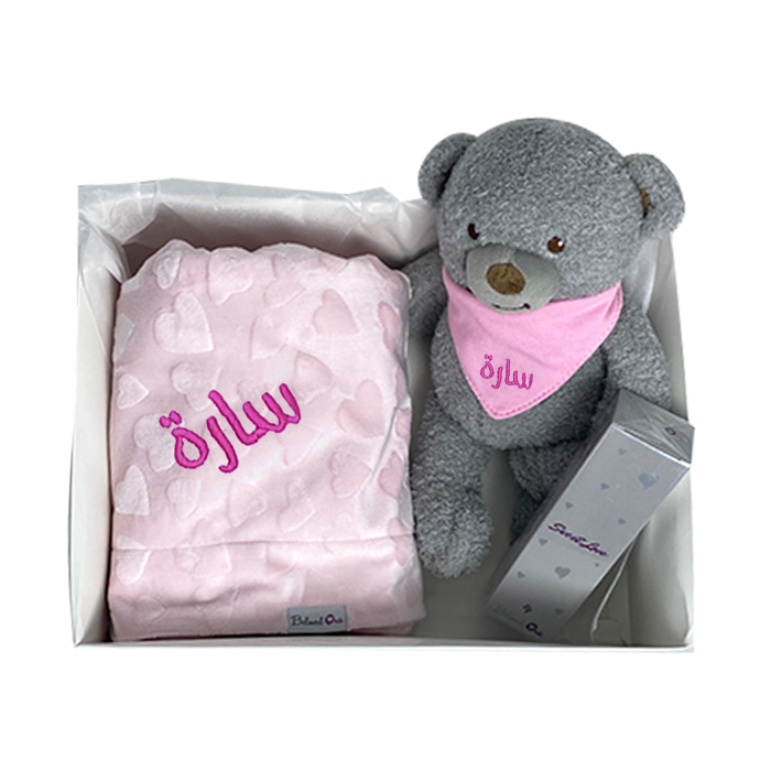 Exclusive Gift-set for new born babies, includes our lovely signature Teddy bear , Perfume and unique Mini Blanket measuring (80cm x 75cm).