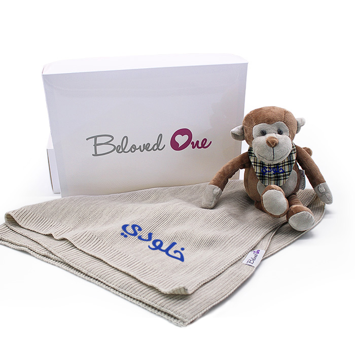 Exclusive gift set for new born babies includes our lovely Monkey and unique Blanket. Available for Boys and Girls. A unique Gift for your #BelovedOne