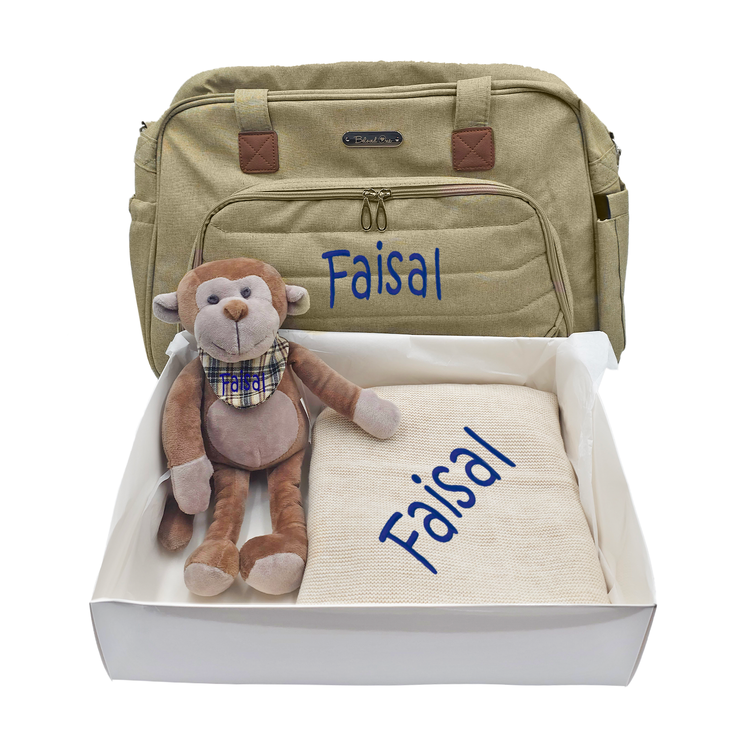 A special gift set, personalized big diaper bag designed to ensure parents have a utilitarian and stylish bag at their disposal for whenever they step out with their newly born child, comes with a personalized warm blanket and lovely monkey.