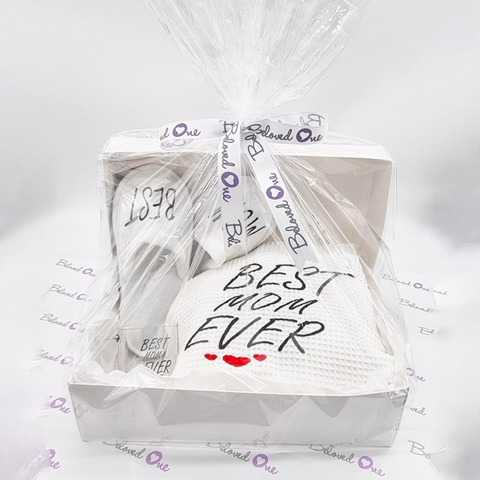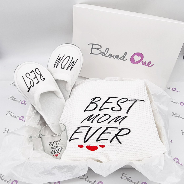 Impress special moms in your life with our unique and beautiful gift set Contains a bathrobe,mug, and a slipper with a special sentence ( Best Mom Ever )