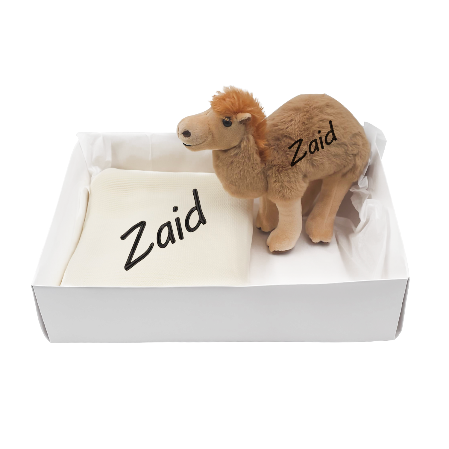 Our unique knitted blanket and personalized camel are perfect gifts for newborns and babies. The blanket is made from 100% polyester, ensuring softness and comfort, while the camel is crafted from durable nylon and cotton.
