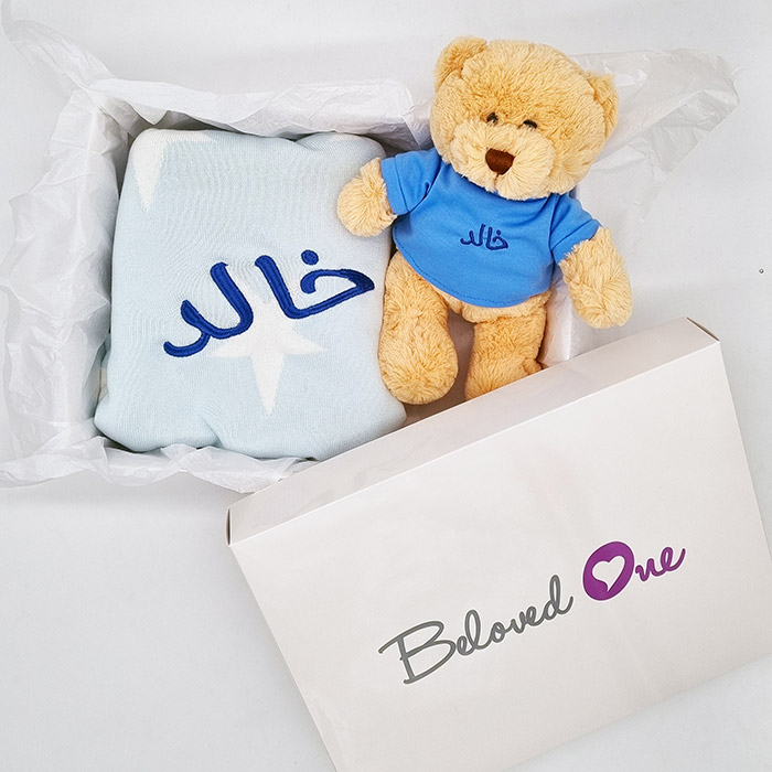 Exclusive gift set for new born babies includes our lovely teddy bear and star blanket.