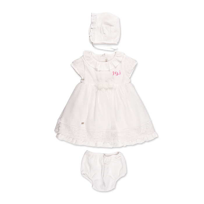 Special Personalized white dress for girls , with hair accessory. contains 3 pieces available in 4 different sizes